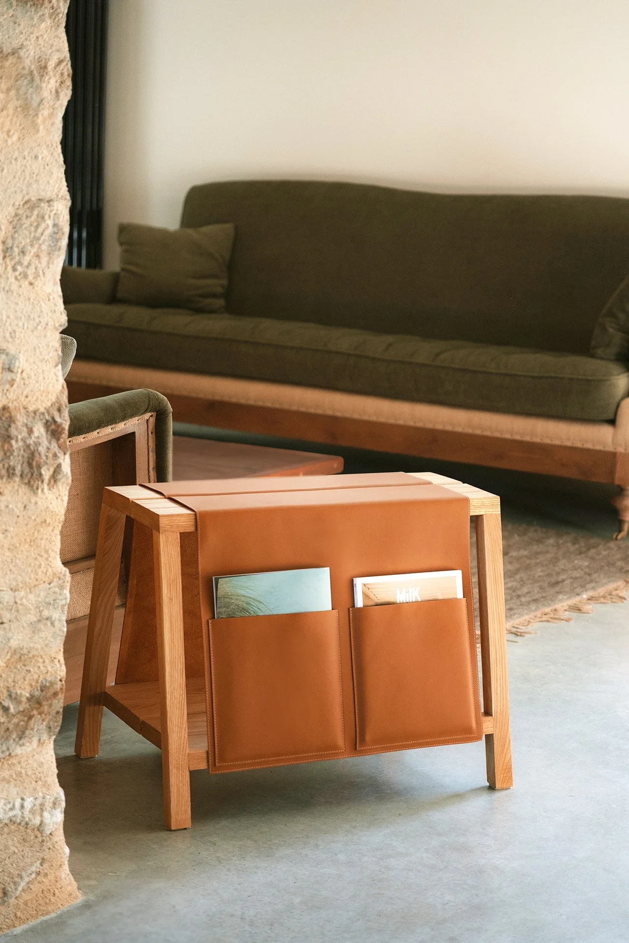 Table d’appoint, bout de canapé et porte-magazine, SELA propose un usage hybride du petit mobilier de salon. Développé en collaboration avec Lucie Hennebicq, artisan d’art sellier maroquinier, SELA est un clin d’oeil aux traditions du travail de sellier. Et plus particulièrement aux outils utilisés en maroquinerie, notamment le chevalet porte-peaux, traditionnellement réalisé en bois.